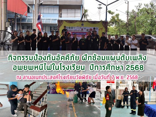 โรงเรียนวัดพิชัย โดยนางสาวเตียงคำ เตโช ผู้อำนวยการสถานศึกษา เป็นประธานเปิดกิจกรรมป้องกันอัคคีภัย ฝึกซ้อมแผนดับเพลิง อพยพหนีไฟในโรงเรียน ประจำปีการศึกษา 2568 โดยได้รับการสนุนวิทยากร อุปกรณ์ และการฝึกอบรม จากศูนย์ความปลอดภัยในการทำงานเขต 12 (มีนบุรี) และชมรมเครือข่ายความปลอดภัยพระนคร และภาคีเครือข่าย โดยมีวัตถุประสงค์เพื่อเตรียมความพร้อมรับมือสถานการณ์ฉุกเฉิน สร้างความรู้ความเข้าใจในการใช้อุปกรณ์ดับเพลิง การแจ้งเตือนภัย การอพยพไปยังจุดรวมพลอย่างปลอดภัย และการประสานงานช่วยเหลือผู้ประสบภัย ซึ่งเป็นส่วนหนึ่งของแผนป้องกันอัคคีภัยของโรงเรียน เมื่อวันที่ 7 พฤศจิกายน 2568 |