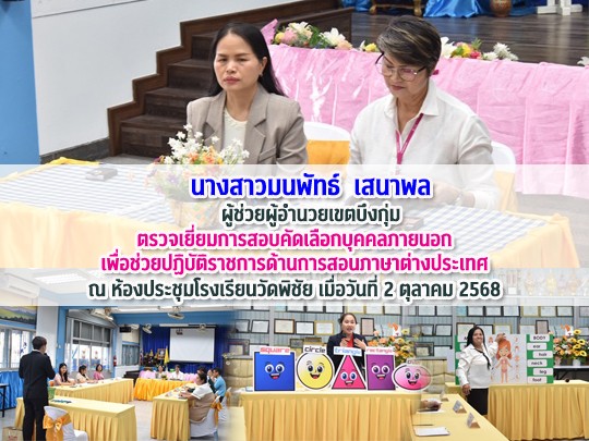 นางสาวเบญจพร ศักดิ์เรืองแมน ผู้อำนวยการเิขตบึงกุ่ม มอบหมายให้ นางสาวมนพัทธ์ เสนาพล ผู้ช่วยผู้อำนวยการเขตบึงกุ่ม พร้อมด้วยนางสาวณัฐินี ได้ฤกษ์โหร์ หัวหน้าฝ่ายการศึกษา ตรวจเยี่ยมการสอบคัดเลือกบุคคลภายนอกเพื่อช่วยปฏิบัติราชการสอนภาษาต่างประเทศ (ภาษาอังกฤษ และภาษาจีน) ณ ห้องประชุมโรงเรียนวัดพิชัย เมื่อวันที่ 2 ต.ค. 68 |